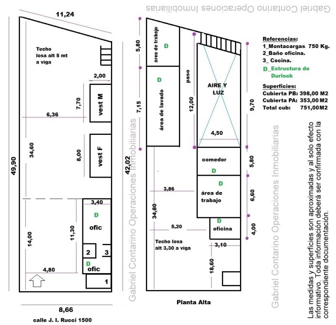 Desarrollado sobre lote de 8,66 de frente, 11,24 de contrafrente, 49,90 y 42,,02 en sus laterales. Entrada de Contenedor, Piso de H°A°. Techo de losa altura 5 metros a la viga. Oficina, cocina y baño. Amplia oficina para varios puestos. Portón tipo cancel para ingresar con vehículo y evitar la vista al interior. A continuación superficie de trabajo sin columnas. 2 vestuarios nuevos para ambos sexos con duchas. Al frente Montacargas de 750 Kg. Medidas 1,90x 3,30 mt. Al fondo escalera de hormigón. P. Alta: Al frente espacio libre de columnas, techo de losa altura 3,30 a la viga. Portón al frente para ingreso de maquinas o materia prima. Oficina. Amplio ambiente de trabajo con piso cerámico. Comedor personal con parrilla. Aire y luz. Sector de lavado con piletas de cemento. Varios espacios construidos con durlock por lo que se pueden desmontar fácilmente. Muy buen estado general.