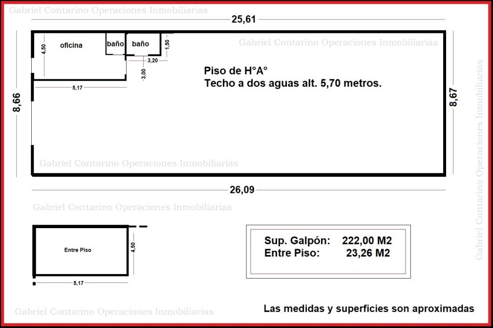 Piso de H°A°. Techo a 2 aguas altura 5,70 metros a la cabreada.