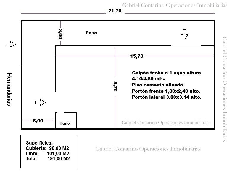 Se trata de un depósito de 90 M2, con techo a un agua alturas 4,10 y 4,60 metros. Piso de cemento alisado. Baño.